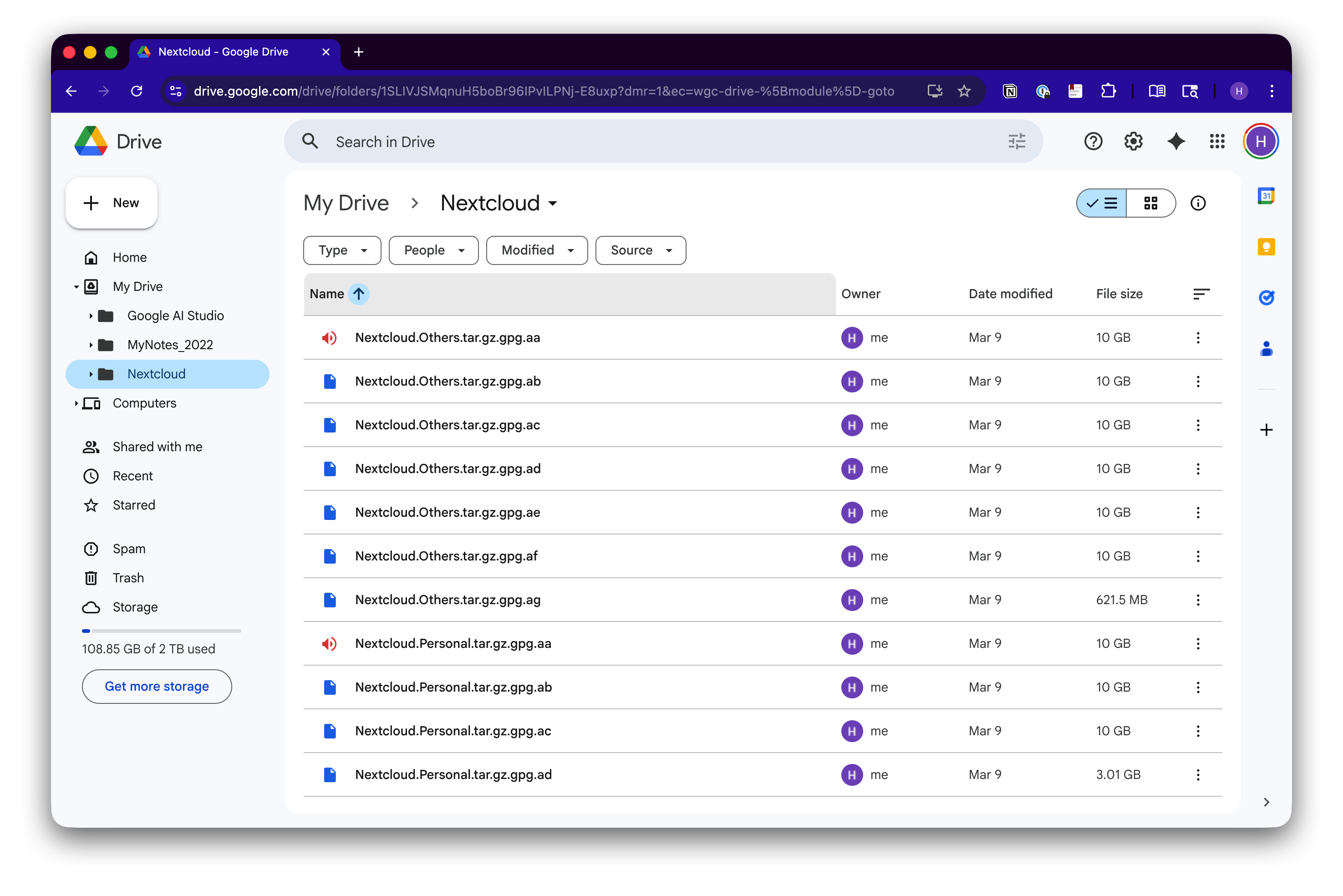 把最重要的 4 个文件夹打包后用 gpg 加密,然后分割成 10G 一个的文件,上传到 Google Drive,作为冷备,增加一份保障。