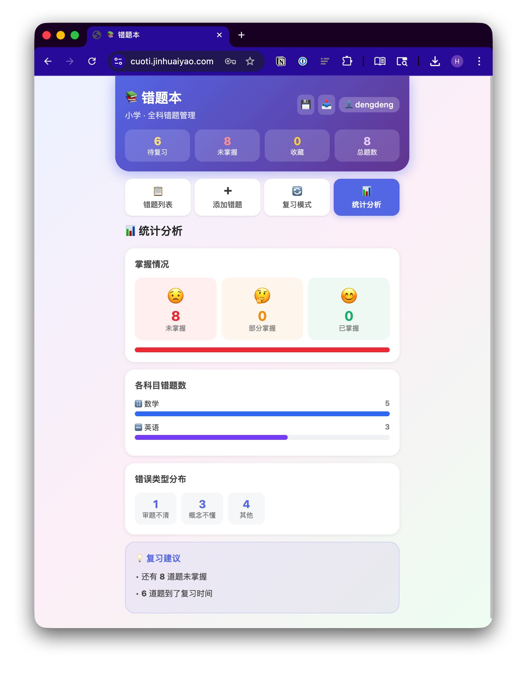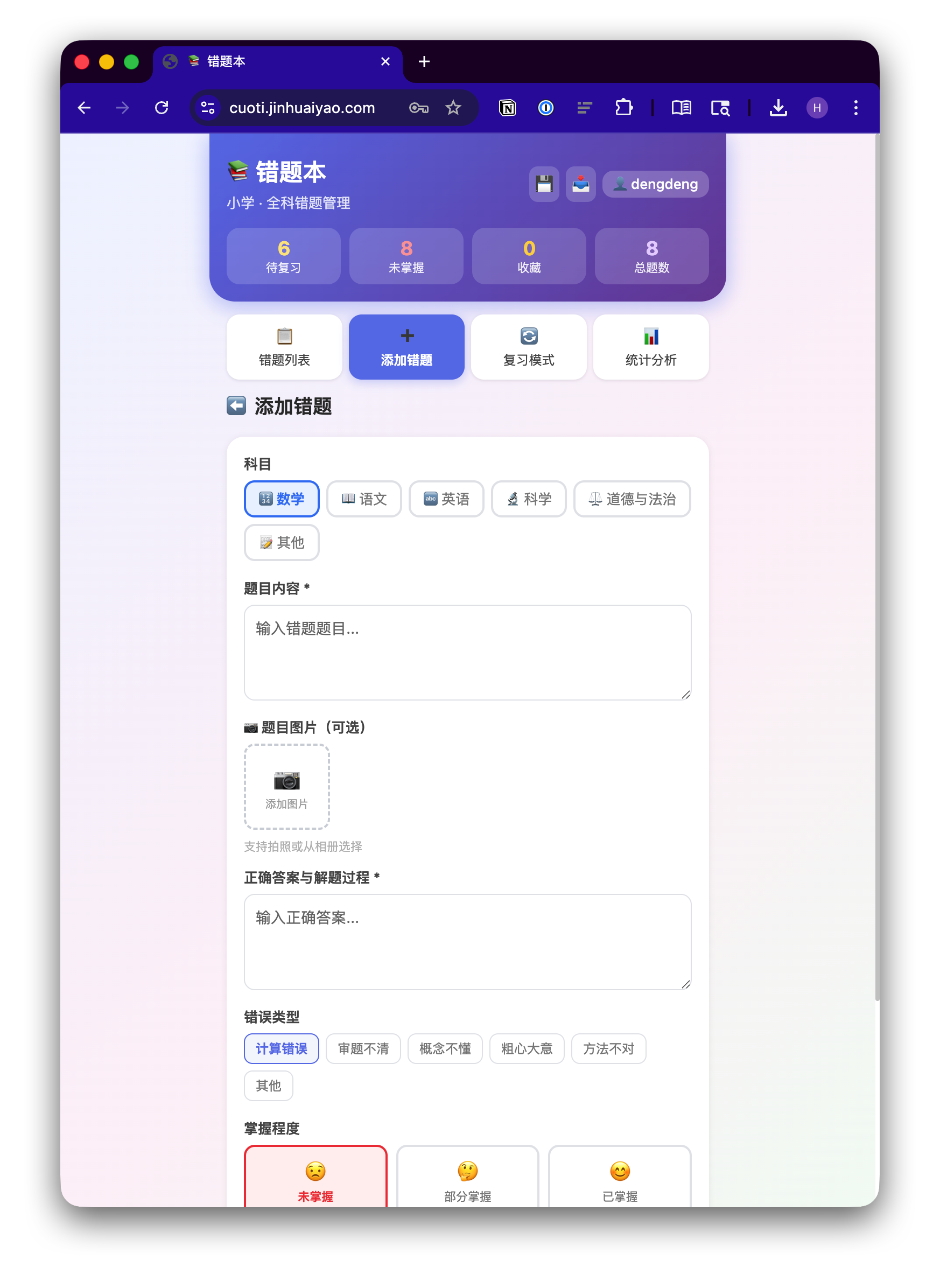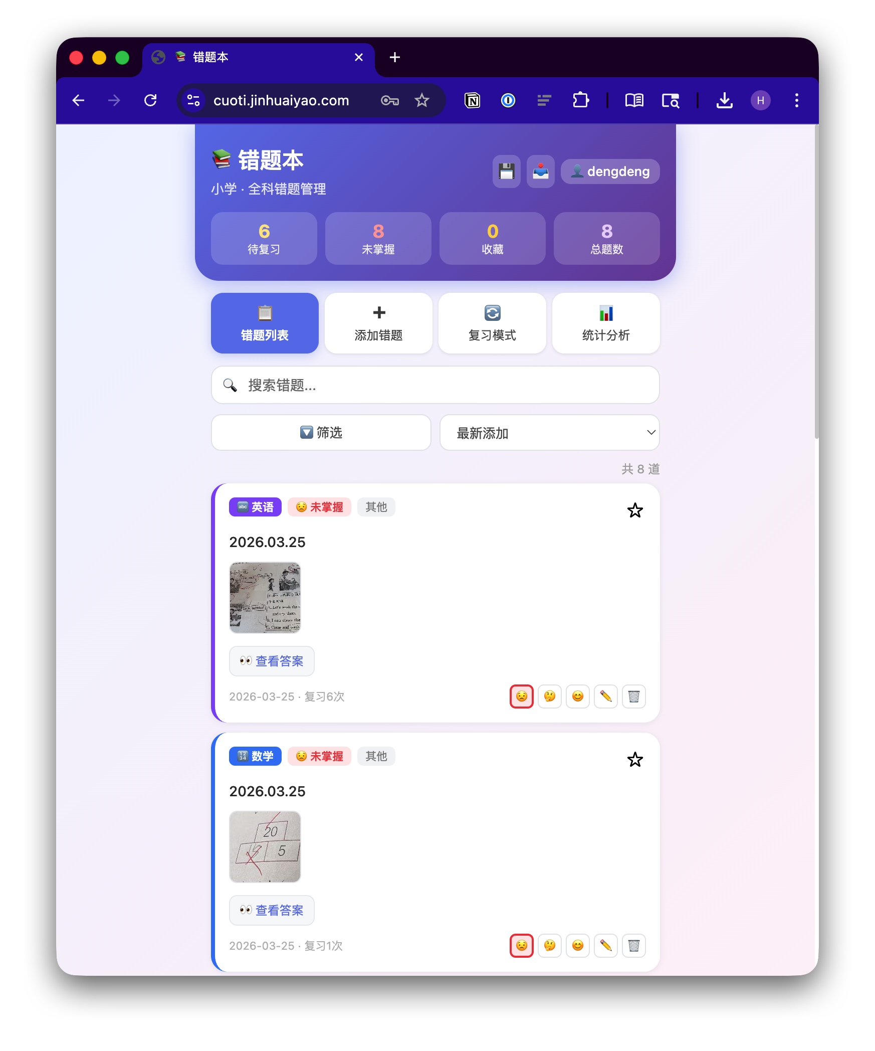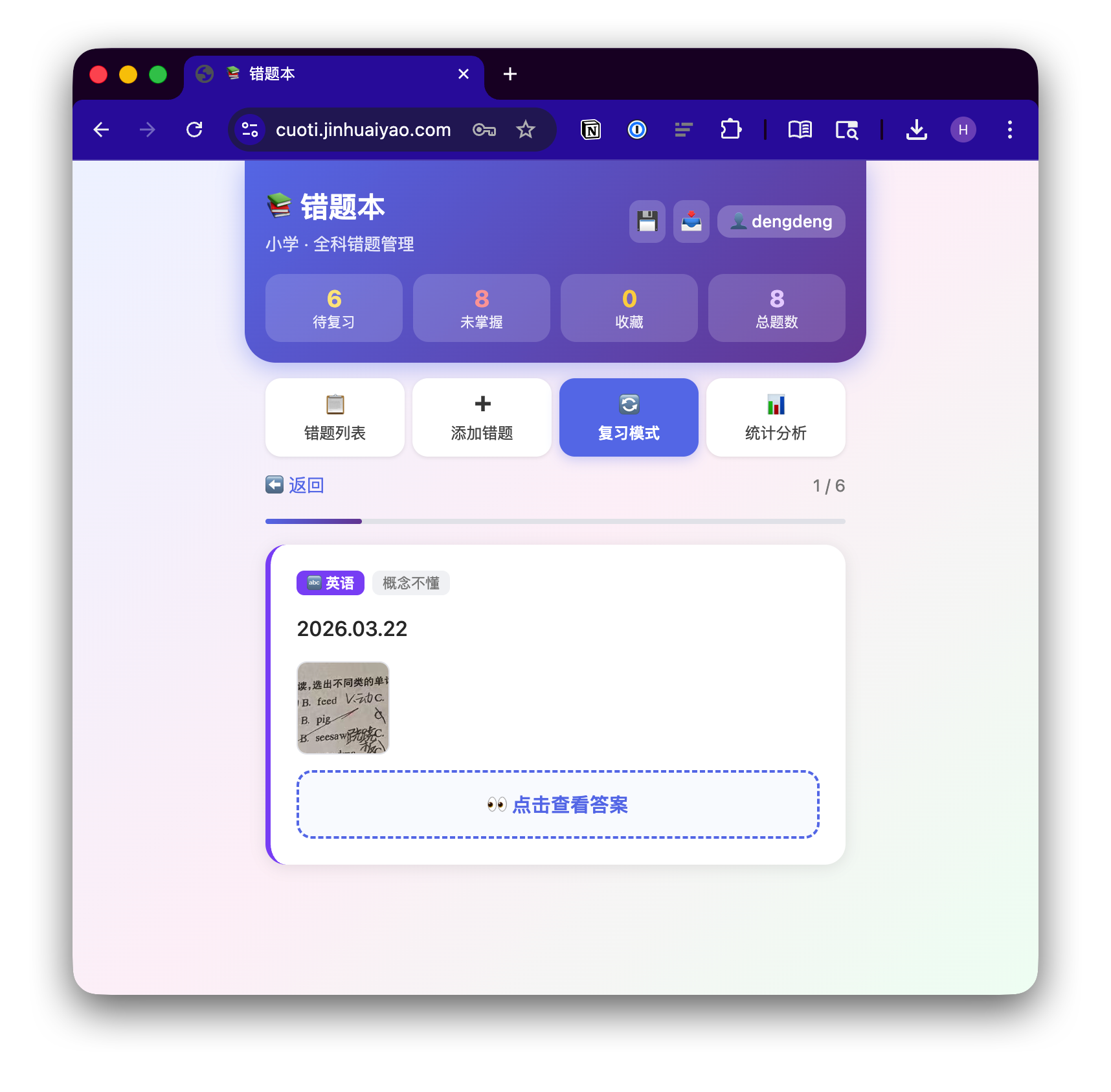 把代码部署到自己的云服务器,测试一下,让 AI 修复几个问题。再配置一下 Nginx,一个轻量、开箱即用的错题管理系统就能工作了,支持拍照上传、间隔复习、多用户、邀请码注册。一小时就搞定了。