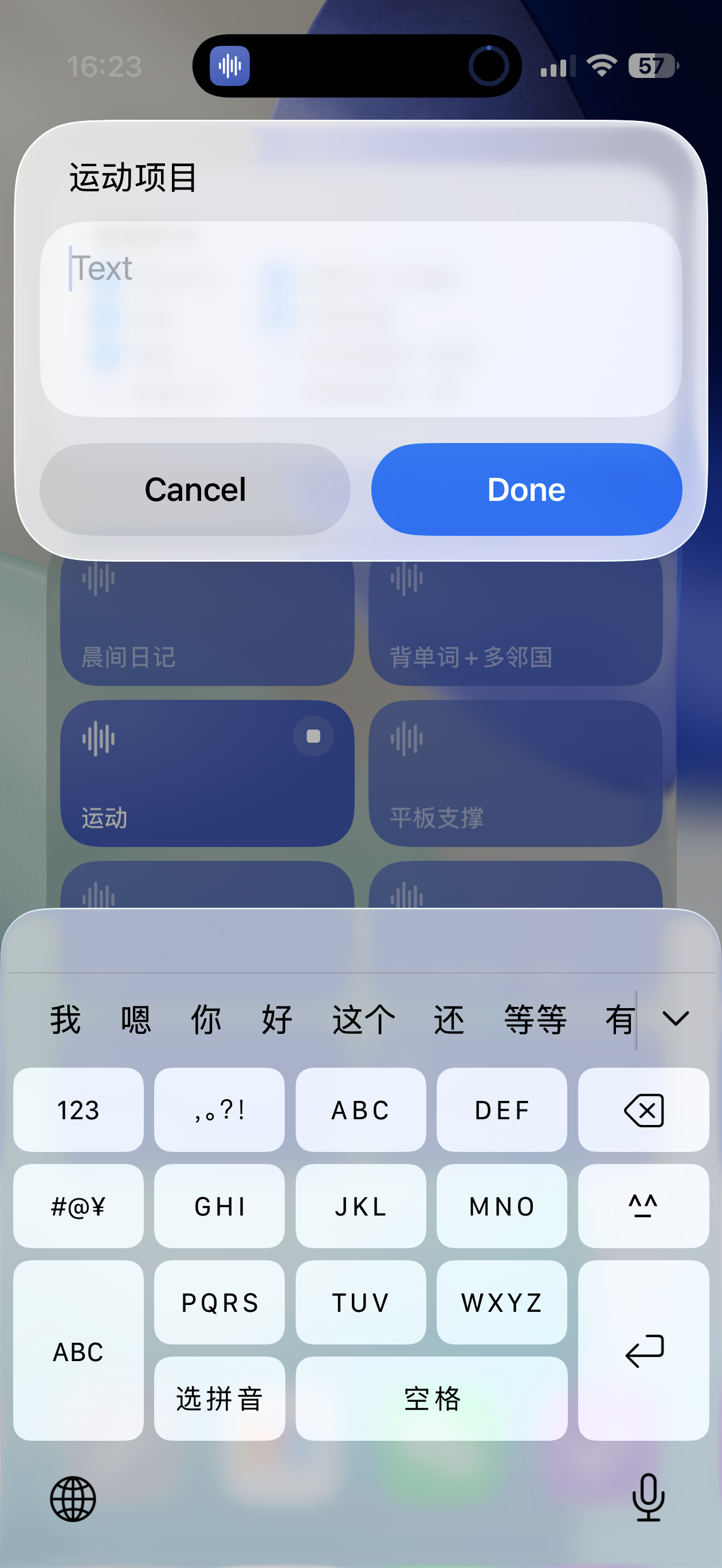 这里有两种按钮,一种是不需要输入内容的,例如“晨间日记”。另一种是需要输入具体内容的,比如“运动”。